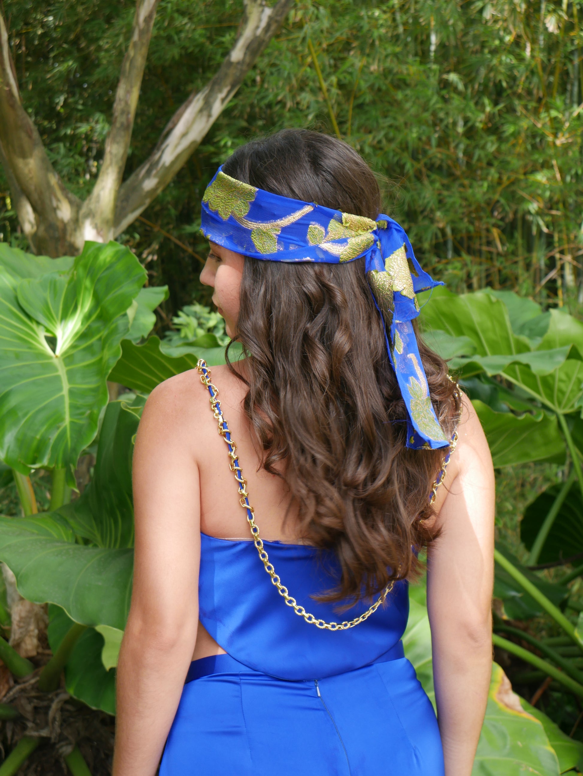 The chain strap top radiates modern elegance with a bold, tropical edge. Crafted from lustrous cobalt blue silk, it features a softly draped bodice that flatters the figure while creating natural movement. The delicate gold-chain straps add a touch of sophistication and contrast, merging effortless sensuality with refined detail.